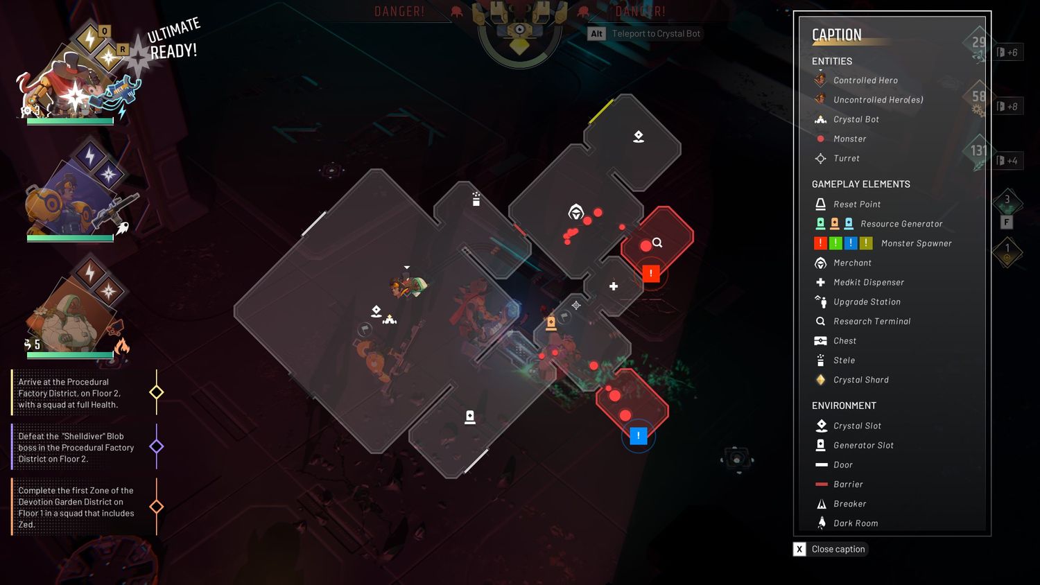 Grupos de uno a tres jugadores eligen un único punto de partida a partir del centro (una IA básica puede reemplazar a uno o dos compañeros en el modo individual) y tres zonas de inicio eventualmente se desbloquean con las claves de distrito que se encuentran en áreas posteriores. Cada bioma posee su propio sabor temático y diferentes tipos de generadores de monstruos, todos los cuales reaccionan a sistemas elementales simples de piedra, papel y tijera, donde ciertos elementos son más débiles o más fuertes contra mobs específicos. El objetivo general en cada nivel es llevar el robot de cristal de principio a fin, mientras oleadas de criaturas lo apuntan implacablemente para destruirlo, una eventualidad que funciona como una eliminación del equipo.