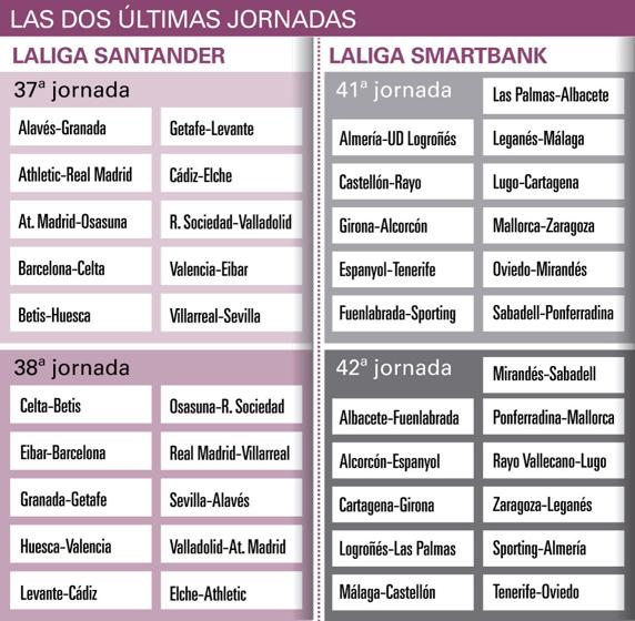 La medida afectará a las jornadas 37ª y 38ª de LaLiga Santander, que se jugarán a las 18.30 del domingo 16 de mayo y 18.00 horas del día 23, respectivamente, así como a las jornadas 41ª y 42ª de LaLiga SmartBank, ambas a las 21.00 horas del 24 y el 30, anunció el organismo en una nota informativa.