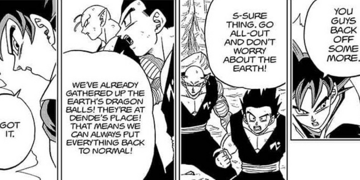 La razón por la que Goku pudo hacer todo lo posible mientras luchaba contra Moro en la Tierra sin tener que contenerse es porque Gohan y los otros Z-Fighters ya habían recolectado las Dragon Balls de la Tierra y estaban listos para usarlas para restaurar el mundo en caso de que fuera diezmado en el fuego cruzado. . Si bien recolectar todas las Dragon Balls de la Tierra sería una historia completa en un momento, esta vez sucede completamente fuera del panel y sirve solo como un dispositivo de trama, liberando a Goku de cualquier razón para contenerse contra Moro. El uso de Dragon Balls en este caso demuestra que se han convertido en los aspectos menos interesantes de la serie, y el enfoque principal se dirige hacia los luchadores divinos y las apuestas del fin del mundo.