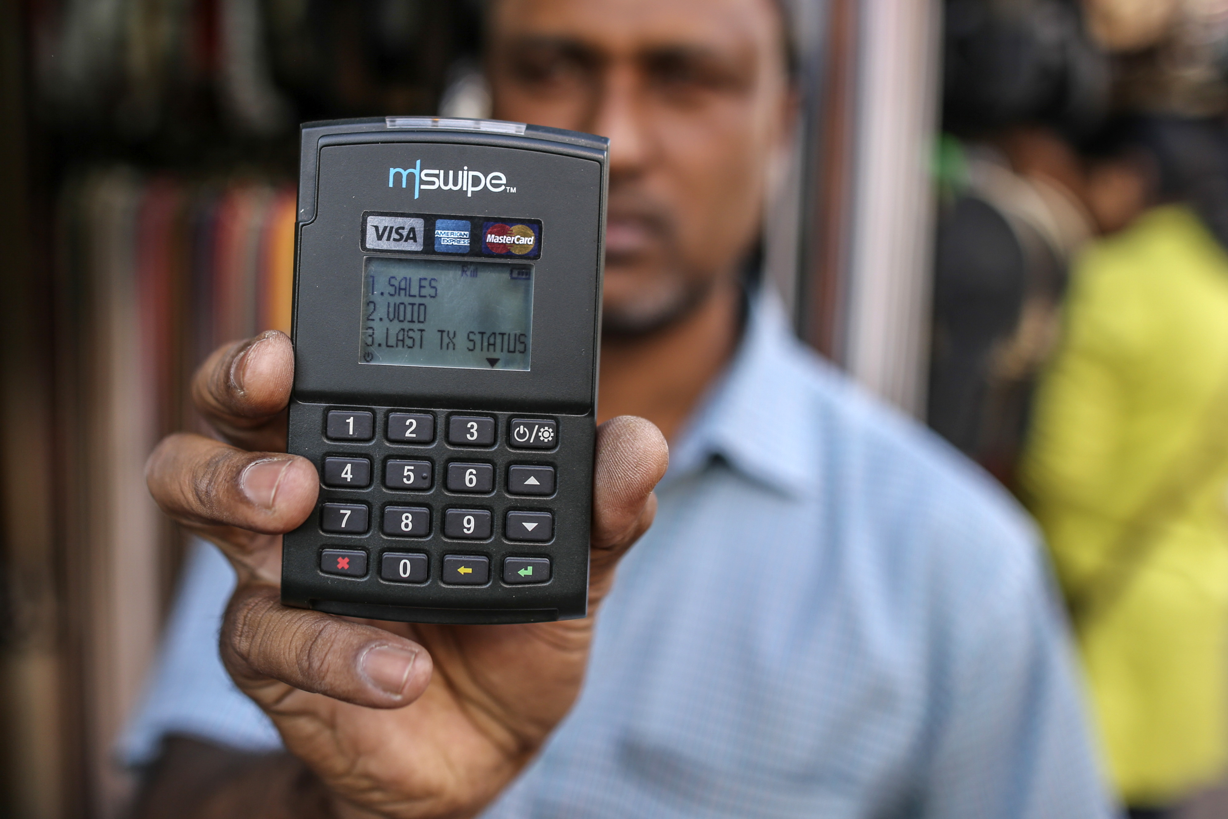 Un vendedor tiene una terminal Mswipe, operada por M-Swipe Technologies Pvt Ltd., en una fotografía organizada en un puesto de carretera en Bengaluru, India, el sábado 4 de febrero de 2017. (Fotógrafo: Dhiraj Singh / Bloomberg a través de Getty Images)