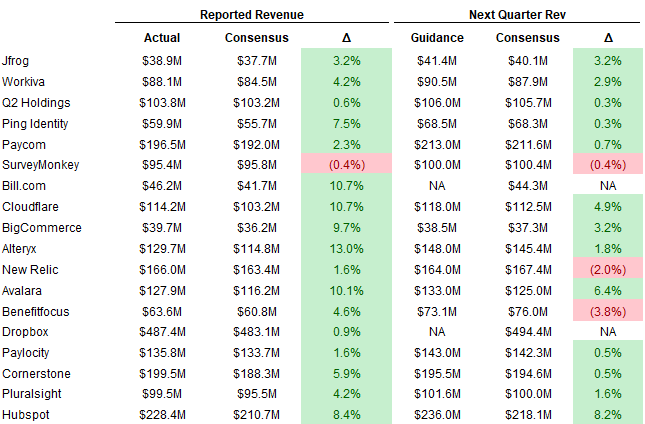 Como podemos ver, hubo una sola falla entre el grupo en el tercer trimestre. Como era de esperar, esa empresa, SurveyMonkey, también fue una de las tres empresas de SaaS que proyectaron los ingresos del cuarto trimestre por debajo de las expectativas de la calle. Mi lectura de ese gráfico es ver un poco menos del 80% del grupo que proyectó la orientación del cuarto trimestre que supera las expectativas es alcista, al igual que los resultados del tercer trimestre, que incluyeron un buen número de empresas que superaron los objetivos en al menos un 10%.