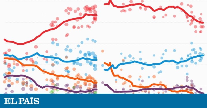 Las tendencias son claras: La izquierda está parada (o a la baja), Ciudadanos detiene su caída y suben dos partidos: Vox y el PP.¿Consecuencias de Cataluña? Los estudios más recientes hicieron sus entrevistas el viernes pasado y pueden capturar los efectos de la sentencia del ‘procés’, de las manifestaciones y de los disturbios, pero solo hasta cierto punto: esos sucesos estaban todavía ocurriendo y sus consecuencias se verán mejor en unos días.La suma de derechas recupera terreno. El bloque de izquierdas ha estado por delante desde las elecciones de abril, pero su ventaja se ha estrechado. Si en junio PSOE y Podemos superaban al PP, Ciudadanos y Vox en casi cinco puntos, ahora ese margen no llega a dos puntos.