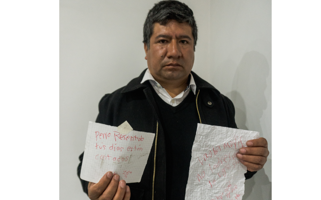(Foto: Jheyson Soto) Uno de los religiosos denunciantes, Antonio Campos, recibió en su domicilio dos pedazos de papel con amenazas de muerte para él y para su pequeño hijo: “Vas a morir. No ladres a la iglesia. Tu hijo está vigilado” (junio 2019) y “Perro resentido, tus días están contados” (noviembre 2018).
