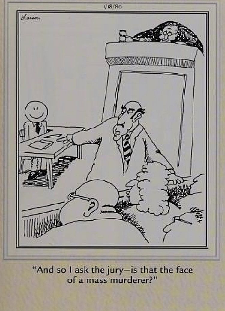 El primer panel judicial de Gary Larson se produjo apenas unas semanas después El lado lejano publicación. Si bien el estilo artístico de Larson se desarrollaría rápidamente durante los primeros años de existencia de la tira, su patentado sentido del humor se hizo evidente de inmediato. Aquí, un abogado defensor se dirige al jurado, señala a su cliente y pregunta: “¿Es esa la cara de un asesino en masa?“Por supuesto, el chiste es que El acusado se dibuja como una simple carita sonriente platónica, en yuxtaposición con el presunto crimen atroz por el que está siendo juzgado.. De esta manera, el artista satiriza la idea de que la apariencia influye en la forma en que los jurados deliberan sobre cargos graves.