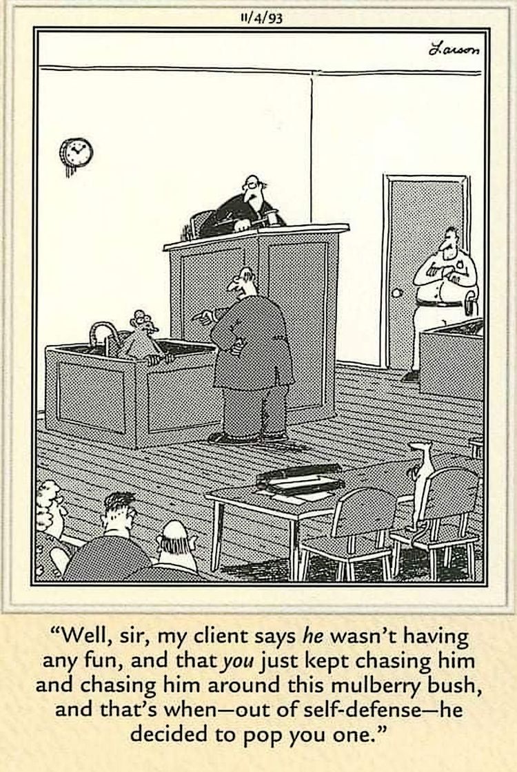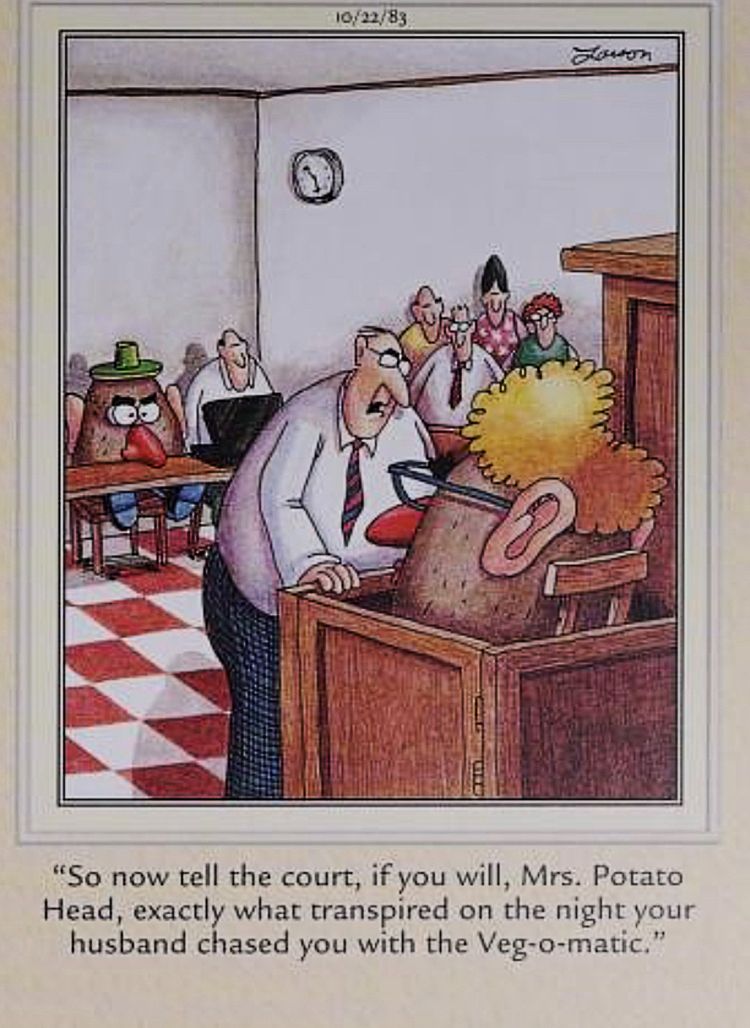 Este panel es otro ejemplo de cómo Gary Larson toma algo familiar e inocuo y le inyecta una mezcla de inquietud y absurdo. En este caso, los juguetes Sr. y Sra. Potato Head están ante el tribunal, y la esposa testifica contra su marido. “Exactamente lo que ocurrió la noche que su marido la persiguió con el Veg-o-Matic?”, le pregunta un abogado a la Sra. Potato Head, en el estrado de los testigos. Detrás de él, el Sr. Potato Head la mira fijamente. La tensión de la vida real de tal escenario, mezclada con la tontería de los Potato Heads, resume perfectamente cómo Larson bordeó la frontera de la controversia a lo largo de la tirada.