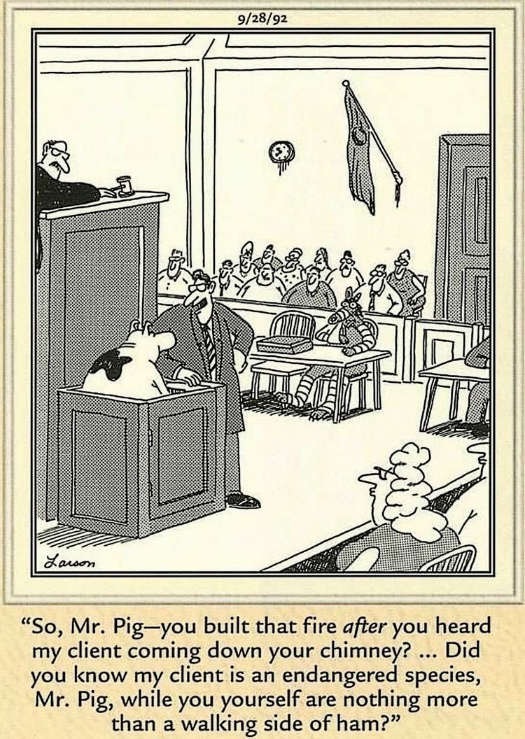 Aquí, Larson imagina los procedimientos judiciales que siguieron a los acontecimientos de los “Tres cerditos”. Este panel se destaca por incluir un título particularmente denso, al menos por el El lado lejano estándares habituales, ya que el abogado del lobo es el que se enfurece esta vez, reprendiendo abiertamente al Sr. Pig en el estrado de los testigos, despreciándolo como “nada más que una guarnición de jamón.” Ciertamente, a esto debe seguir una objeción por parte del abogado del Sr. Pig, ya que está claro que El abogado del lobo intenta intimidar al testigo y perjudicar al jurado contra sus acciones, que fueron tomadas en defensa propia.