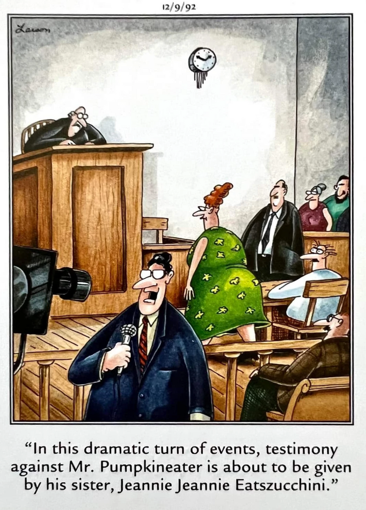 En este panel, Gary Larson lleva a juicio al protagonista de la canción infantil “Peter Peter Pumpkineater”, y un periodista de televisión informa que su hermana “Jeannie Jeannie Eatszucchini” ha comparecido para testificar. Más allá de la broma obvia, Este panel es el comentario de Larson sobre la tontería inherente de convertir actividades cívicas, como los procedimientos legales, en entretenimiento. y más específicamente la práctica de informar directamente desde el interior de los tribunales, que se estaba convirtiendo en un fenómeno cada vez más popular a principios de los años 1990, y que se volvería más omnipresente a medida que avanzaba la década.