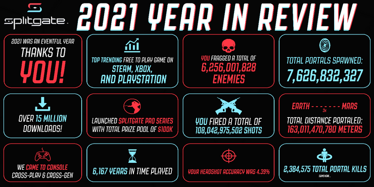 Hay incluso más estadísticas en la infografía, una combinación de divertidos recuentos de números e hitos. Splitgate aparentemente fue el juego gratuito de mayor tendencia en Steam, Xbox y Playstation, además de lograr más de 15 millones de descargas solo en 2021. Este éxito fue ayudado por el lanzamiento del juego en consolas, tanto con cross-gen como con cross- play support para fusionar las diferentes comunidades del juego. La infografía incluso se vuelve tan granular como para contar el número total de disparos y muertes logradas, tanto con portales como sin ellos. Esos números son igualmente grandes, por lo que está claro que Splitgate está viendo mucho tiempo de juego.
