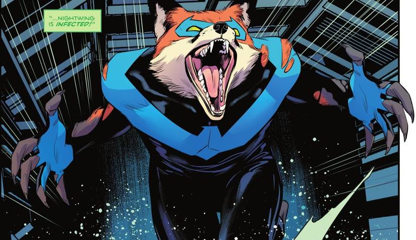 El artista japonés @taratara_studio destacó magistralmente el cambio de Nightwing a zorro, así como la furiosa mirada de hombre lobo de Red Hood, junto con la transformación felina de Damian Wayne.al representar el momento en que las esporas los infectaron hasta su forma final.