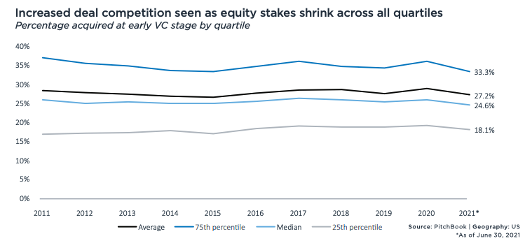 Para resumir lo que publicó PitchBook: los tamaños de las rondas aumentan a medida que aumentan las valoraciones, y con el último aumento más rápido que el primero, no vemos que los inversores obtengan más propiedad a pesar de que tienen que gastar más para acceder a las ofertas.