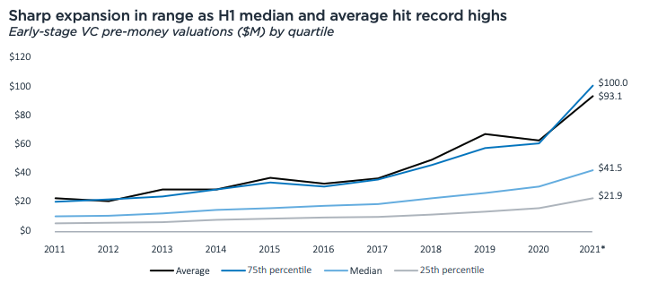 El conjunto de datos de PitchBook tiene otros superlativos dignos de mención. Las valoraciones antes del dinero de semillas centradas en la empresa alcanzaron un promedio de $ 11 millones en la primera mitad de 2021, un máximo histórico. Las valoraciones de las primeras etapas para las nuevas empresas centradas en la empresa también alcanzaron nuevos récords (92,7 millones de dólares en promedio, una mediana de 43 millones de dólares) este año después de haber aumentado constantemente desde 2011.