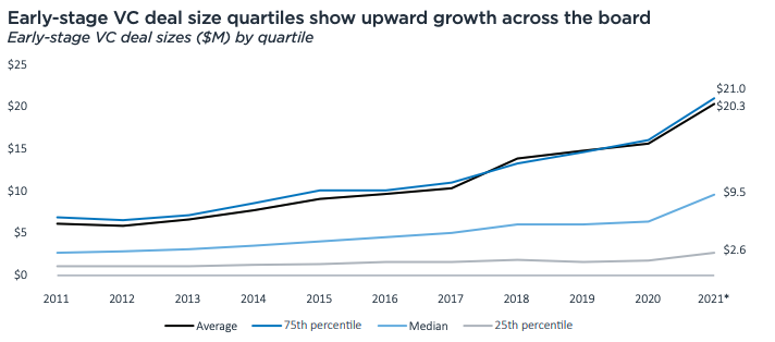 Esos gráficos desmienten un poco la rapidez con que está cambiando el capital de riesgo. Por ejemplo, en 2020, el valor medio de la etapa inicial creado entre rondas fue de $ 16 millones (o una velocidad relativa del 54%, si lo prefiere). En 2021 hasta ahora, son $ 39,4 millones (120% de velocidad relativa). Y esa cifra de 2020 fue un récord anterior. Simplemente se rompió.