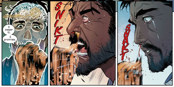 Después de que Omega Wolverine convence a Arnab Chakladar de revelar la ubicación de Moira, él entonces empujones una de sus garras cibernéticas en el cerebro de Arnab a través de su nariz, después de prometer no matarlo. Resulta que esto no lo hizo matarlo, y en su lugar, Logan pudo usar sus nuevos poderes cibernéticos de Phalanx para identificar con precisión en qué parte del cerebro de Chakladar estaba su memoria de su interrogatorio y su tiempo con Moira, y realizar una lobotomía inmediata en esa sección, dejando a Arnab vivo pero sin memoria de los dos últimos números. Esta es una versión increíblemente genial y repugnante de las garras de Wolverine, y las eleva por encima de las simples herramientas para matar. Si bien no es exactamente telepatía, este uso preciso y único de sus garras recuerda al Multiversal Diamond Patch, una fusión entre Wolverine y Emma Frost, del guerras infinitas evento, que pudo usar sus garras de diamante para leer la mente de las personas.