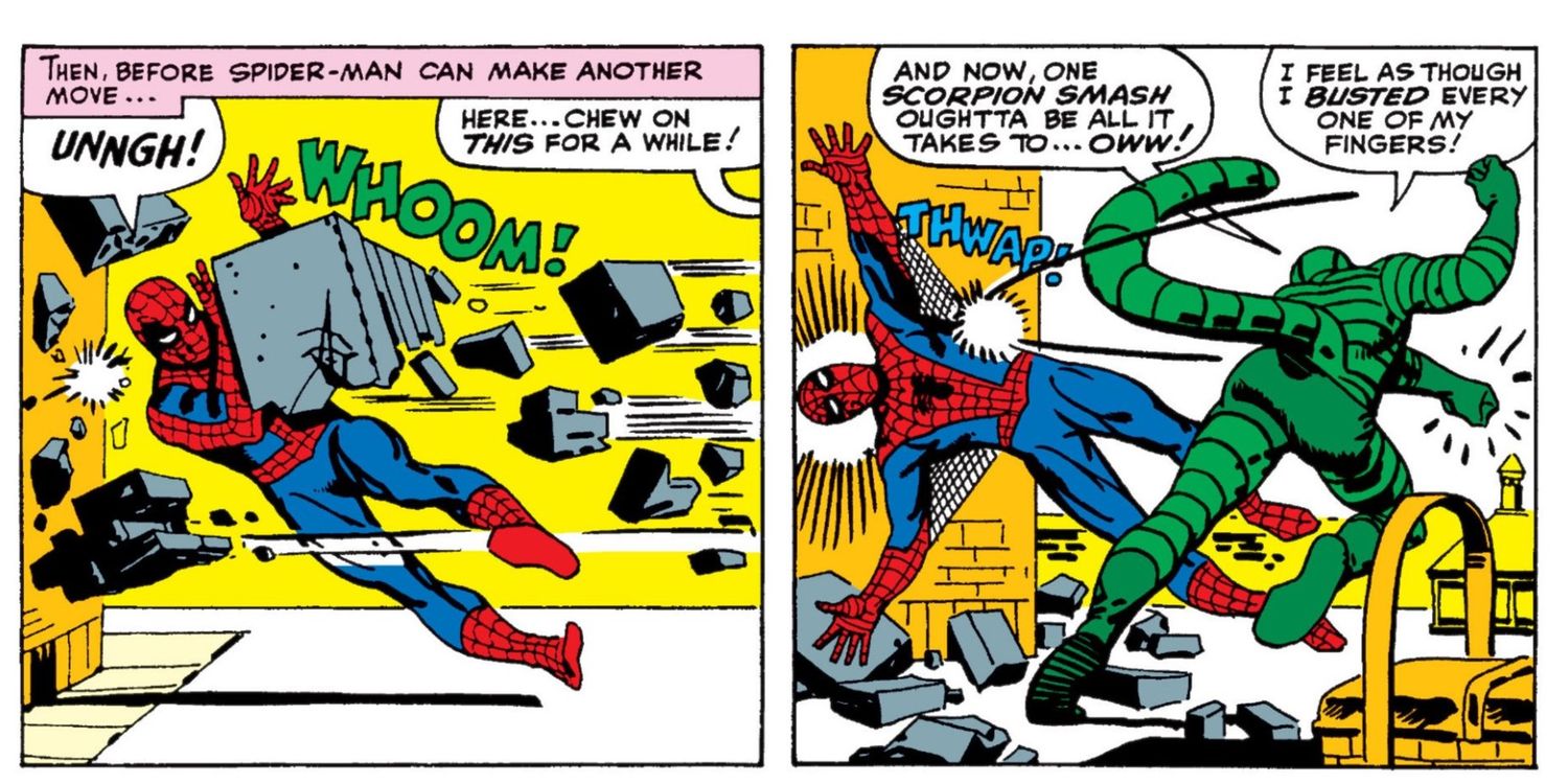 La historia de Spider-Man siempre ha presentado fracasos espectaculares que no se ven comúnmente en la película de superhéroes, y Spidey a menudo se enfrenta a la derrota a manos de sus enemigos dominados como el Doctor Octopus o el Duende Verde (al menos antes de su eventual regreso). El sentido visual único de Ditko, combinado con el estilo de escritura denso de Lee, diseñado específicamente para esa serie, otorgó una conductividad perfecta a la secuencia de acción de El asombroso Hombre Araña. Muchos números contienen escenas que aún serían difíciles de trasladar eficazmente a una serie de televisión gracias a su escala, dinamismo y rapidez.