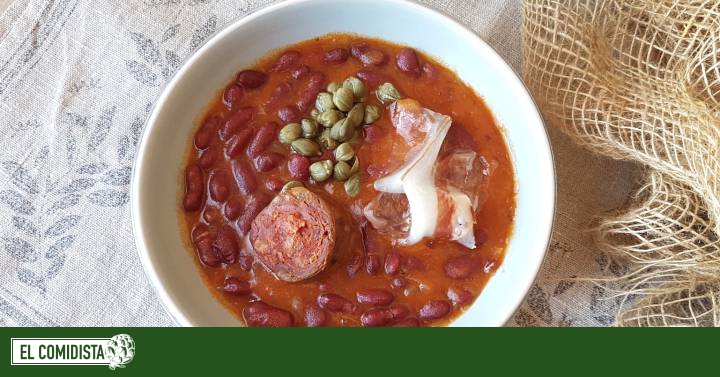 400 g de alubias rojasAceite de oliva virgen extra1 cebolla1 zanahoria1 puerro1 tomatePerejil fresco1 cucharadita de pulpa de pimento choriceroSal200 g de chorizo ibérico12 láminas finísimas de panceta ibérica curada30 g de alcaparrasPimienta negraPreparación