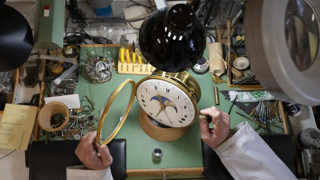 El encargado del taller de relojería, Manuel Santolaya, observa la maquinaria de un reloj ‘bracket’ inglés del siglo XVIII.Juan Millás