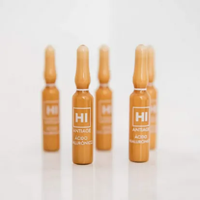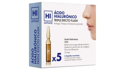 Ampollas de ácido hilurónico triple efecto flash: antiedad, firmeza e hidratación profunda. Cada estuche contiene cinco ampollas, elaboradas con un aplicador y un tapón de ampollas que asegura la higiene y una aplicación precisa. Son ideales para todo tipo de pieles: grasas, mixtas o normales.