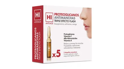 Ampollas faciales triple efecto flash con proteoglicanos, α-Hidroxiácidos, vitamina A, vitamina C, aceite de germen de arroz y aceite de rosa mosqueta. El paquete contiene cinco ampollas monodosis, que incluyen aplicador y un tapón protector. Son perfectas para el cuidado de pieles con manchas por hiperpigmentación o hipopigmentación.