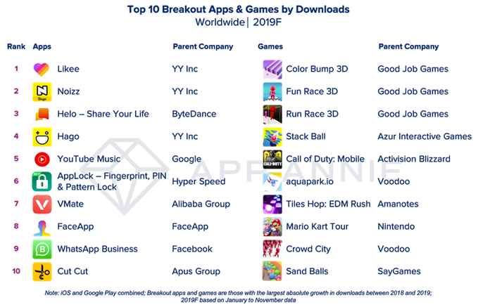La aplicación Annie también echó un vistazo a una nueva categoría de aplicaciones que llama las aplicaciones "destacadas" del año. Estos son los que experimentaron el mayor crecimiento absoluto en descargas o gasto del consumidor entre 2018 y 2019. En esta lista, la aplicación número 7 más descargada del año, Likee, de YY Inc., se convierte en la "ruptura" número 1 aplicación del año, seguida por Noizz y Helo de YY Inc. Mientras tanto, los usuarios indios impulsaron la adopción de la aplicación de juegos sociales Hago en el n. ° 4, que también es popular entre los usuarios de la Generación Z en Indonesia.
