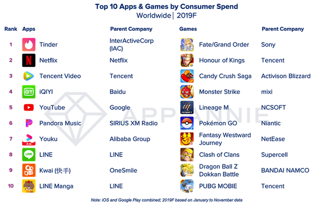 Este año, Tinder cambió de lugar con Netflix para el puesto número 1 en este gráfico: el año pasado, fue al revés. HBO NOW, que experimentó un aumento en el gasto gracias a "Game of Thrones", también cayó fuera de la lista este año, permitiendo que LINE Manga tome su lugar. Tencent Video e iQIYI tienen las mismas posiciones que 2018, mientras que YouTube creció del número 7 al número 5, y Pandora cayó del número 5 al número 6, en comparación con el año pasado.