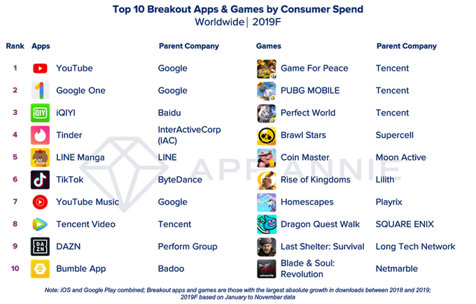 Del lado de los juegos, los títulos hiper-casuales tuvieron éxito, reclamando 7 de cada 10 máquinas tragamonedas en la lista de juegos más destacados del año. También aparecieron lanzamientos populares como Mario Kart Tour y Call of Duty: Mobile. Pero por el gasto de los consumidores, los juegos principales como No. 1 Game of Peace y No. 2 PUBG Mobile, ambos publicados por Tencent, ocuparon los primeros lugares.