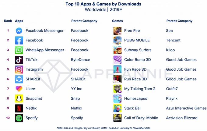 Sin embargo, Facebook todavía poseía la parte superior de las listas. Su aplicación Messenger fue la aplicación sin juegos más descargada de 2019, seguida de la aplicación principal de Facebook, luego WhatsApp.