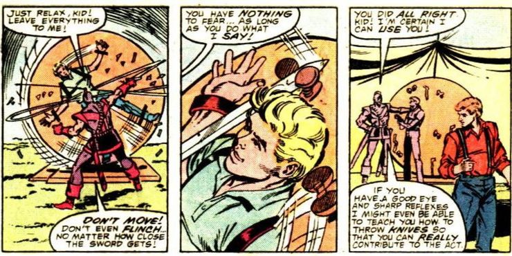 Hawkeye aprendió a usar una variedad de armas mientras era el protegido de The Swordsman en el circo. Uno de ellos eran las armas distintivas del espadachín, los cuchillos. Clint Barton aprendió de cerca y personalmente la habilidad necesaria para manejar cuchillos, ya que a menudo se encontraba en el centro de la atracción donde The Swordsman le arrojaba cuchillos.