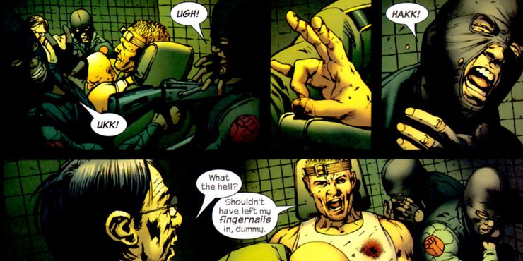 En una de las secuencias más ingeniosas e inquietantes de la línea Ultimate Comics, Hawkeye usa sus uñas como armas mortales contra un grupo de atacantes enmascarados. Hawkeye es uno de los mejores artistas marciales de Marvel Comics, y en Ultimates # 2, lo prueba sin lugar a dudas. Después de ser capturado y torturado, usa todo lo que tiene, sus uñas afiladas, para liberarse.