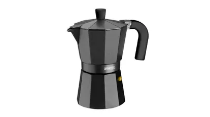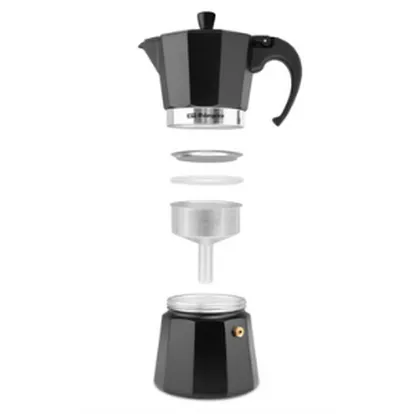 Cafetera con capacidad para seis tazas (300 mililitros) con unas dimensiones de 18 x 15 x 12,5 centímetros, apta para todo tipo de cocinas salvo las de placas de inducción. Tiene un acabado negro con un efecto mate, que le otorga elegancia y un estilo sofisticado. Dispone de un asa de baquelita termo-resistente ergonómica, para un agarre fácil y seguro.