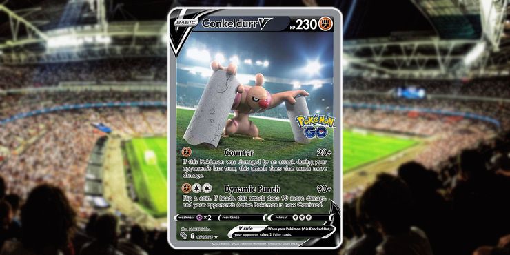 En el Pokémon GO JCC En el juego, la tarjeta Conkeldurr V presenta ilustraciones alternativas del tipo Fighting parado en un campo de hierba en medio de un estadio. La carta rara también viene equipada con el poderoso movimiento Dynamic Punch, que puede causar 180 de daño con un lanzamiento de moneda.