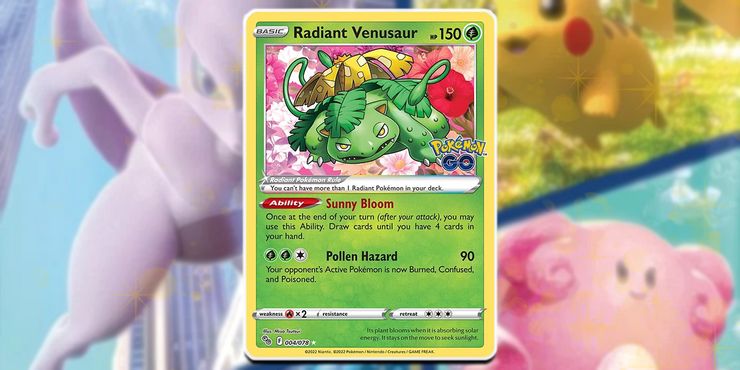 los Pokémon GO JCC Radiant Venusaur también es una de las cartas más poderosas de la expansión Summer, ya que su movimiento Pollen Hazard hace que el Pokémon activo de un oponente se queme, confunda y envenene, todo al mismo tiempo. Su habilidad Sunny Bloom incluso permite a los jugadores robar cartas al final de cada turno.