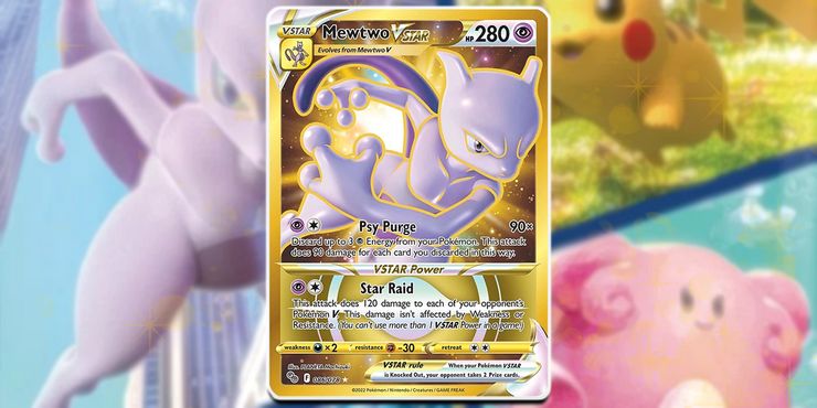 Generación 1 pokémon rojo y azul El legendario Mewtwo hace su aparición una vez más, esta vez como una tarjeta VSTAR en el Pokémon GO JCC establecer. La tarjeta VSTAR Mewtwo presenta un diseño increíble que retrata al Pokémon legendario preparándose para desatar una explosión de energía psíquica en la batalla. El dibujo de primer plano casi parece 3D, ya que Mewtwo parece estar saltando fuera del borde de la tarjeta. Como si el coleccionable raro no fuera lo suficientemente impresionante, su versión Secret Rare lleva el VSTAR al siguiente nivel con una hermosa textura dorada en capas por toda la tarjeta.