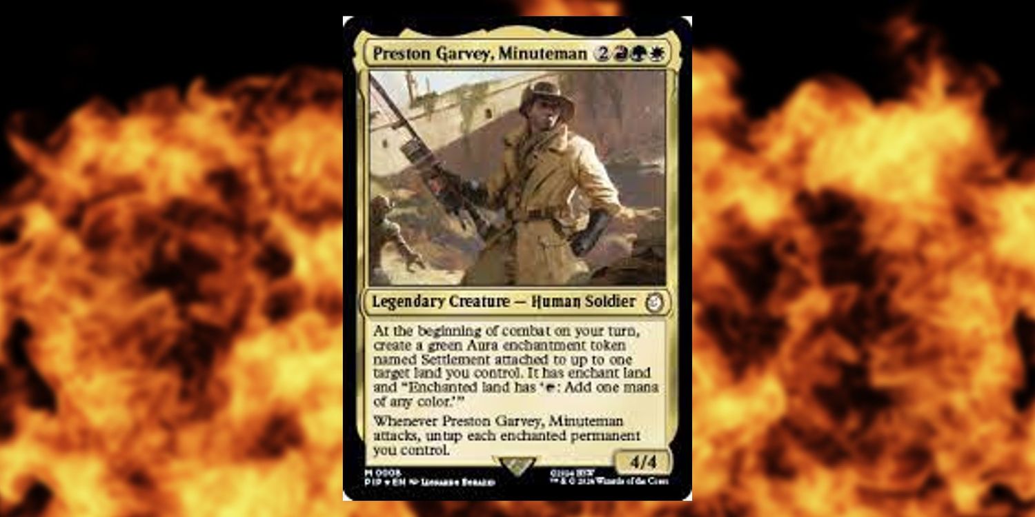 La tarjeta, Preston Garvey, Minuteman, es otro comandante viable para Magia: La reuniónPreconferencia de Scrappy Survivors. En lugar de construir el mazo alrededor de Dogmeat, este comandante se enfoca en Auras para encantar principalmente tierras. Tu objetivo es generar una enorme cantidad de maná enderezando tus tierras encantadas después de atacar con Preston. Esto te permitirá lanzar más hechizos finales para, con suerte, terminar el juego.