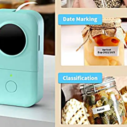 Etiquetadora portátil para el hogar y la oficina en color azul y blanco, ideal para mantener organizados y marcados diferentes elementos como tarros en la cocina o cajas en el armario.
