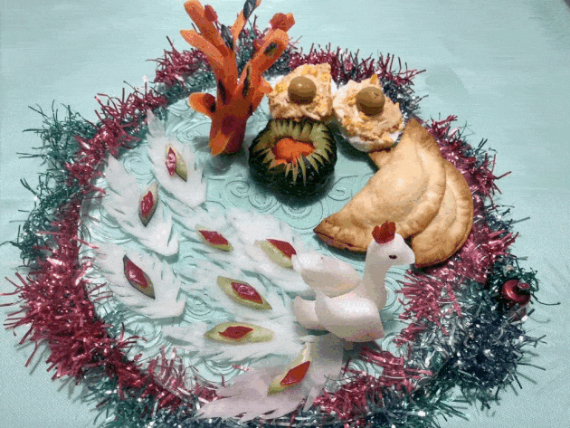 Como siempre, con tanto nivelazo ha sido una tortura elegir ganadores. Pero había que hacerlo, así que el primer premio es para Ana I. Cabañero, por este sueño febril hecho realidad al que podríamos llamar El lago de los cisnes, las empanadillas y los huevos rellenos. El jurado ha valorado especialmente la delicadeza de la composición y el cuidado de los detalles: el arbolito de zanahoria, las plumas del ave (¿o son bebés cisne?), el espumillón decorativo, los hombres de nieve de huevo, los pingüinos de aceituna, el árbol de Navidad de pepino y maíz… todo es magia en este paisaje helado hecho de comida digno de Fronze.