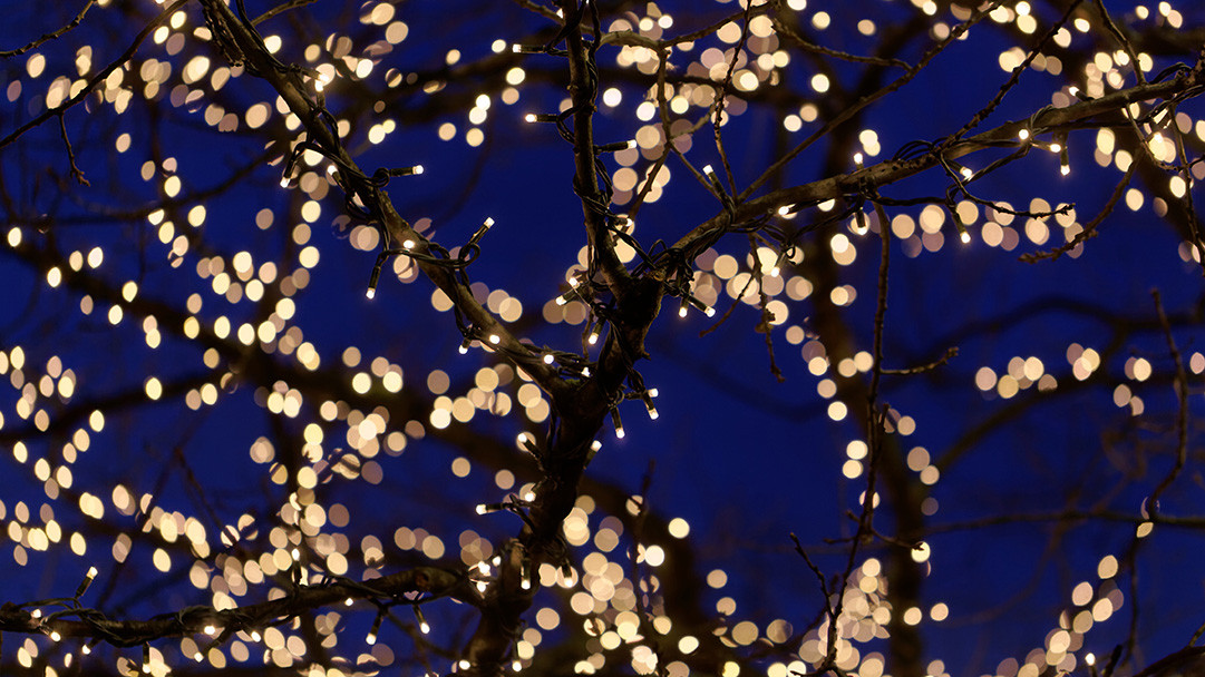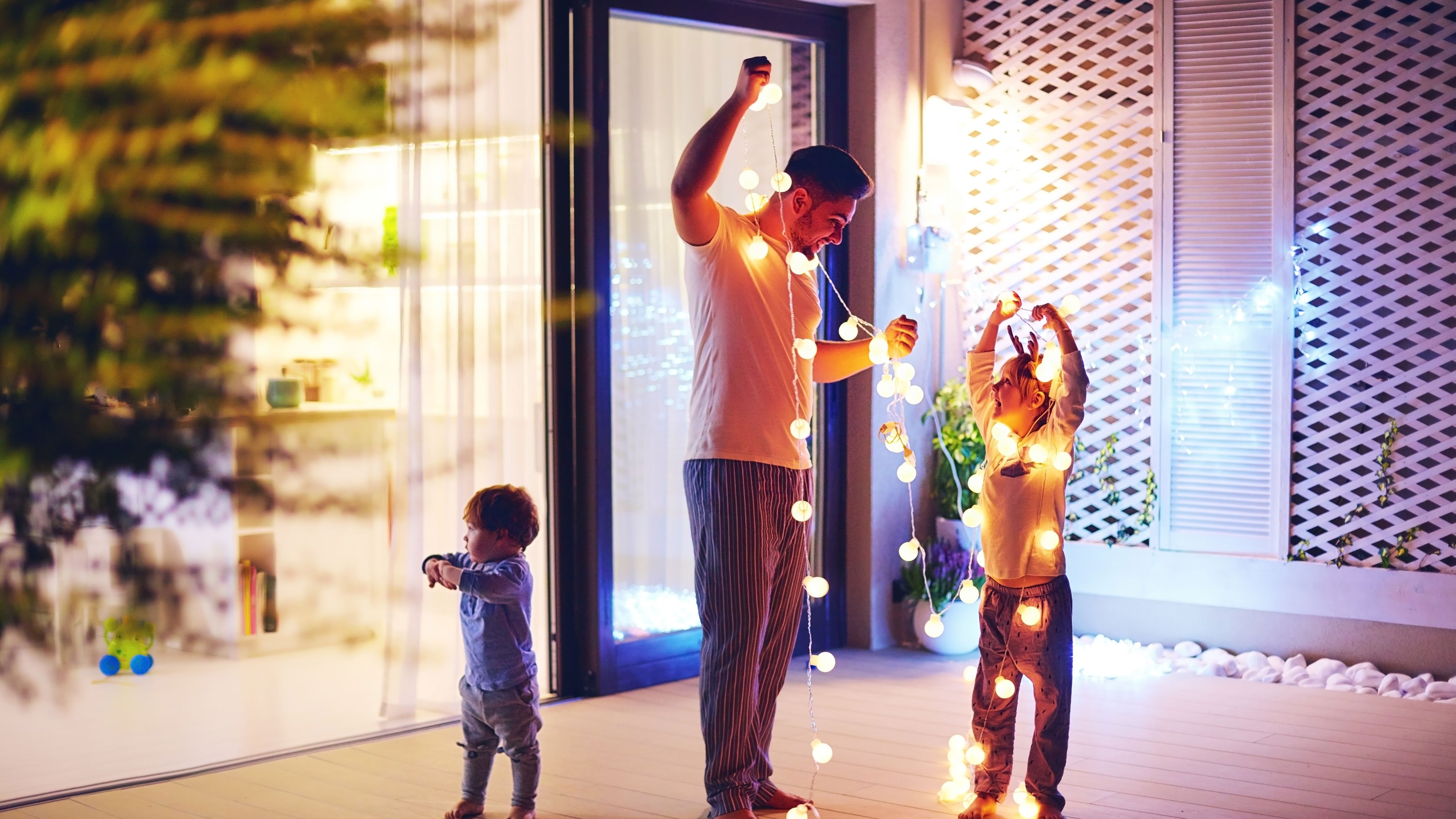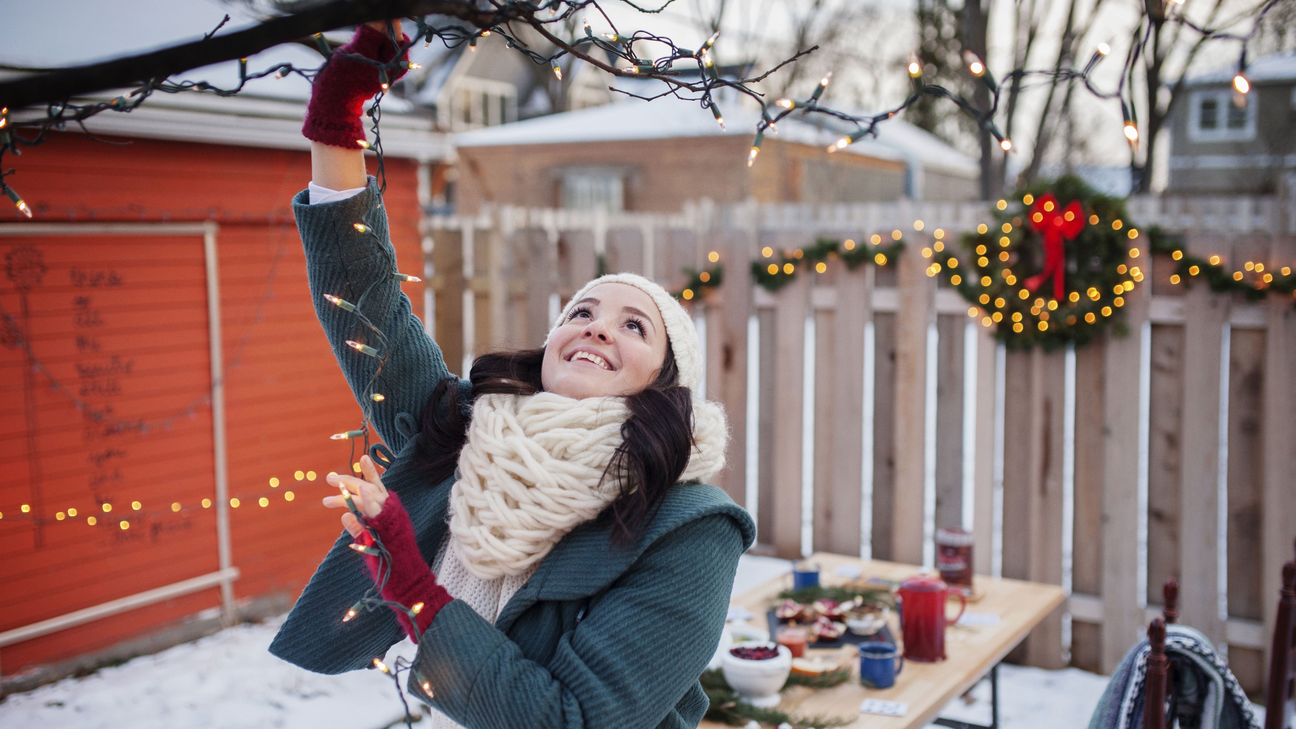 Decorar los aleros y ventanas con luces de cadena es una forma segura de animar tu hogar. También puedes crear un aspecto similar en interiores con “luces de hadas” o luces de cadena en miniatura. De cualquier manera, se aplican los mismos consejos de seguridad. Cuando uses una escalera para llegar a lo alto, asegúrate de que esté firmemente anclada en la base. No sobrecargues un socket con más de tres series. Y considera usar luces LED, que producen muy poco calor.