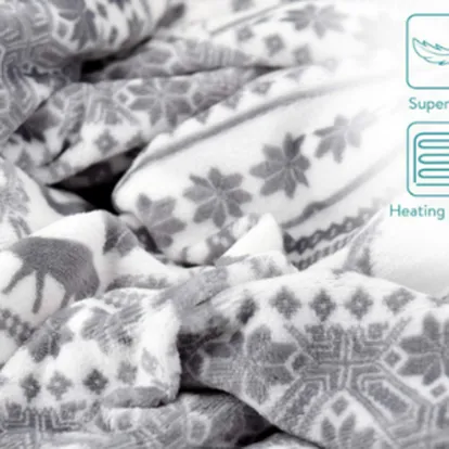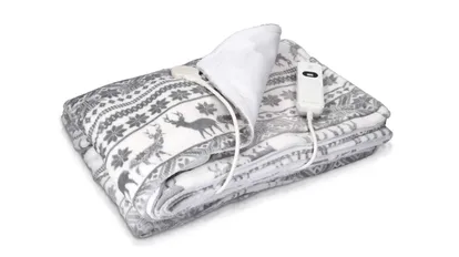 Manta eléctrica grande (180 x 130 centímetros), diseñada con un regulador de temperatura que incorpora tres intensidades diferentes y con un original tejido con patrones de renos, copos de nieve y diferentes formas geométricas. Se ha confeccionado con material de microfibra suave al tacto, garantizando una experiencia agradable en su uso.