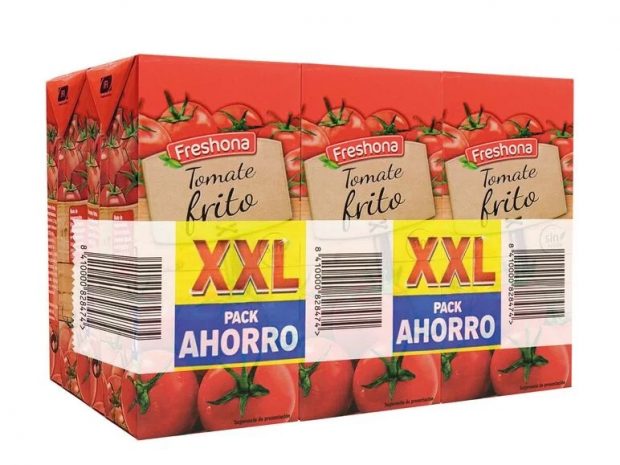 1,39 euros 6 envases de tomate frito en formato XXL. Esta oferta debes aprovecharla. Si en tu casa se cocina día sí y día también arroz a la cubana o pasta para los niños, ahorrarás mucho con este tomate. En caliente o frío estará igual de bueno, unos macarrones con este tomate, atún y huevo duro son perfectos para el verano y los podemos llevar a cualquier parte.