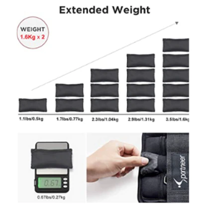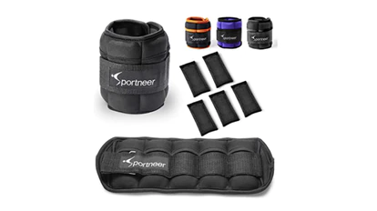 Este paquete incluye dos bandas de pesas para los tobillos y las muñecas. Cada una de ellas pesa 1,58 kilogramos y está compuesta por cinco bolsas individuales de peso. Cada uno de estos compartimentos permite almacenar un peso de 0,27 kilogramos, por lo que se puede ajustar en función de la necesidad, aumentando la resistencia hasta casi dos kilogramos.