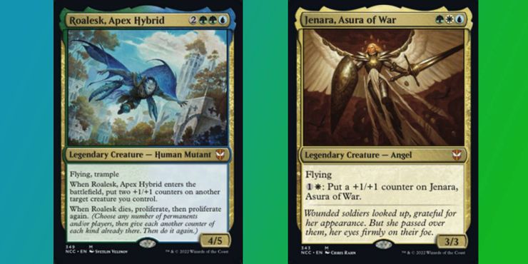Él Corredores engalanados el mazo es verde, blanco y azul, y tiene un gran enfoque en las sinergias de contraataque. Los contadores +1/+1 abundan en Magia: la reuniónla historia de , y Calles MTG de Nueva Capenna además introduce contadores de escudo. En este mazo se pueden encontrar numerosas reimpresiones con la mecánica de proliferación, que agrega contadores adicionales a los permanentes que ya los tienen; Thrummingbird y Grateful Apparition son poco comunes, pero muy relevantes en las contraestrategias (y Apparition nunca se ha reimpreso antes). Jenara, Asura of War es una amenaza voladora que crece rápidamente, mientras que Scavenging Ooze aumenta el total de vidas y niega la interacción del cementerio de los oponentes. Numerosas cartas relacionadas con contadores han recibido sus primeras reimpresiones: Roalesk, Apex Hybrid, Wingspan Mentor y Steelbane Hydra se preocupan por los contadores +1/+1, y Steelbane anteriormente solo estaba disponible a través de Trono de Eldraine establecer refuerzos.