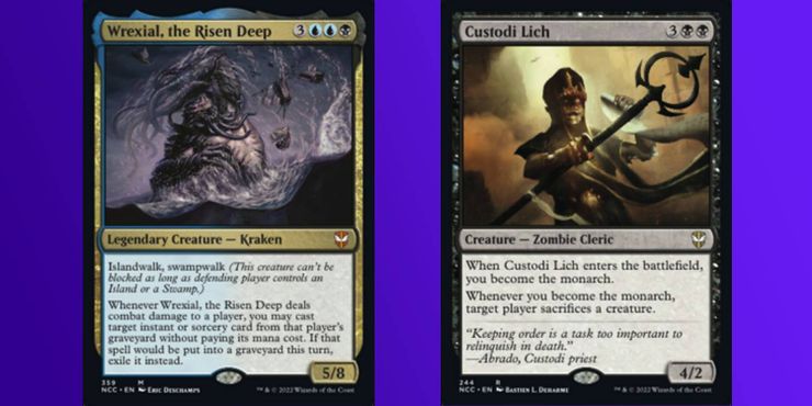 Junto a él hay una serie de cartas que nunca antes se habían reimpreso: Alela, Artful Provocateur es un hada legendaria que recompensa los mazos que juegan con criaturas voladoras y numerosos artefactos y encantamientos; Custodi Lich trae Conspiración: tomar la coronala mecánica del monarca político en los juegos; Thief of Sanity, como Wrexial, roba las cartas de un oponente; y el no-muerto Fallen Shinobi juega muy bien con los ninjas de Kamigawa: Dinastía de neón a principios de este año. También es emocionante la reimpresión más reciente de Austere Command, un tablero flexible que puede destruir amenazas selectivamente y ve un juego significativo en Commander.