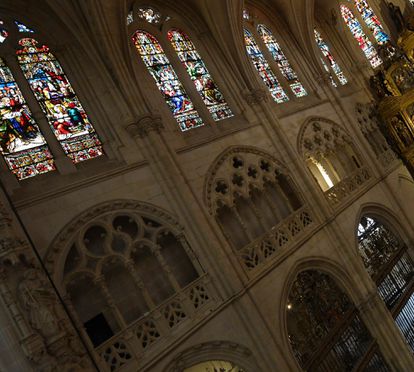 Desde el cimborrio, de vuelta por los tejados de la catedral, se accede al balconcillo que recorre las naves central y del crucero. Antes de llegar a este espacio, Payo y Miguel se cuelan por la parte superior de las bóvedas. Al mirar al techo respiran con cierto alivio. En la restauración de los años setenta se cambió la estructura de madera por una de metal. “No fue la mejor restauración, pero por lo menos ahora estamos seguros de que no nos puede pasar como a Notre Dame”, dice Payo, recordando el incendio del templo de París en 2019. “El triforio es el heredero de las antiguas tribunas románicas. En el gótico sirve para comunicar distintos ámbitos de las zonas altas de la catedral”, explica el experto, asomado en esta balconada desde la que se observa el altar mayor de la catedral.