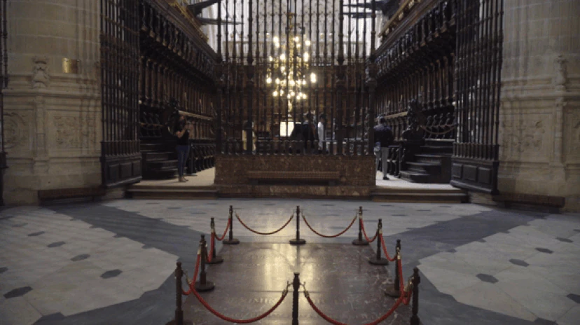 La tumba del Cid está enmarcada por el gran rosetón del brazo sur, “el único conjunto de vitrales originarios del siglo XVIII de la catedral”; la escalera dorada que sirve para unir la puerta de la coronería, es decir, la calle alta de la ciudad con el templo; y el coro del siglo XVI, elaborado en madera por Diego de Siloé, con 103 asientos desde donde se ven dos de los seis órganos que hay en el templo.