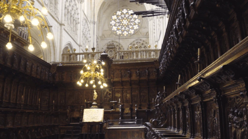 Una vez en el cimborrio, el que se reconstruyó tras el hundimiento del original en 1539, la sensación de vértigo solo se pasa al observar las tallas que componen esta luminaria. “Los dos pisos que constituyen el cimborrio están calados por una serie de grandes ventanales cubiertos con interesantes vidrieras del siglo XVI”, explica Payo. “La bóveda principal, plana, está hecha de tal manera que no solo penetra la luz a través de los ventanales, sino también a través de la zona cenital”.