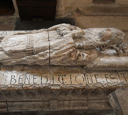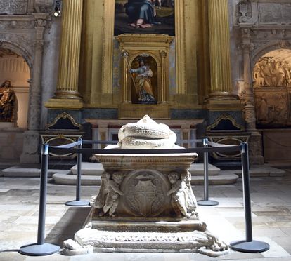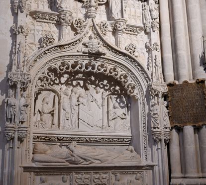 “Las catedrales son espacios de la muerte, espacios funerarios donde se enterraba a grandes personajes”, lanza Payo con solemnidad. Estas personalidades descansan bajo lápidas en el suelo, como el Cid, en tumbas exentas o en tumbas parietales, las que se construyen en las paredes. A don Pedro Fernández de Villegas le enterraron en una de este tipo. “Es un magnífico sepulcro de finales del siglo XVI. Este importante canónigo burgalés pasó buena parte de su vida en Roma. Tuvo gran importancia en la historia de la literatura española porque fue uno de los traductores de la literatura italiana del trecento, en concreto fue el primer traductor de la Divina Comedia de Dante”, recuerda el catedrático. Su deseo era ser enterrado en la catedral. Las obras de su sepulcro terminaron en 1500, pero tardó 30 años más en morir. Durante tres décadas pudo contemplar la que sería su tumba.
