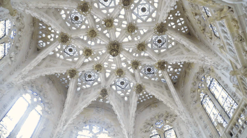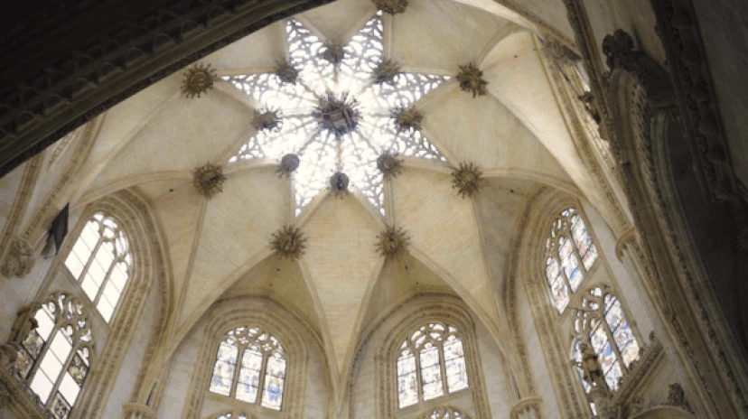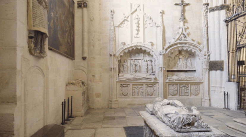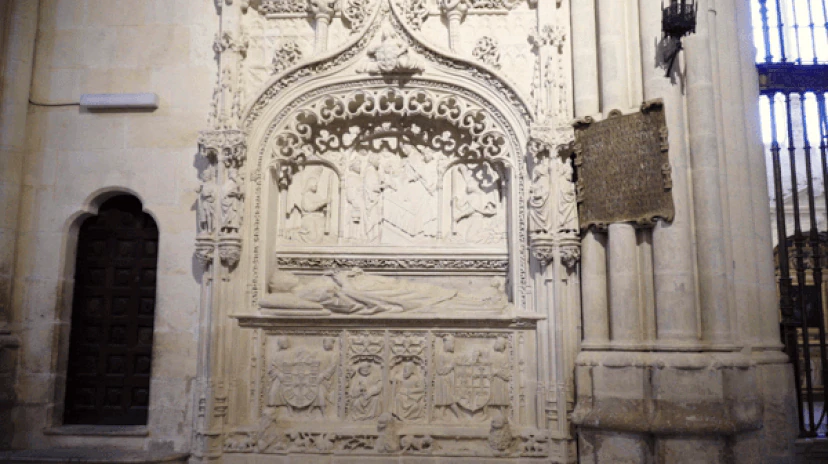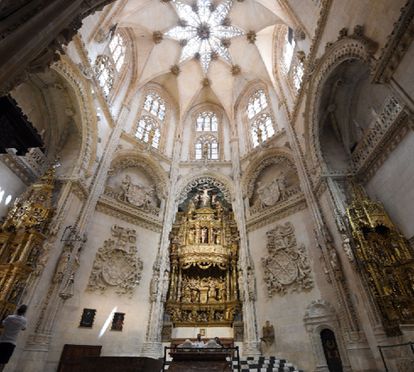 La construcción de esta capilla comienza cuando el condestable se marcha a la guerra de Granada y le deja encargado a su esposa la construcción de una capilla funeraria. “Este espacio lo levanta Simón de Colonia sobre una pequeña capilla, la de San Pedro, y una serie de terrenos que se ganan a la ciudad. Desarrolla una arquitectura grandilocuente marcada por la luz porque la capilla está dedicada a la presentación del niño en el templo, a la fiesta de las candelas”, explica el experto. Al mirar hacia arriba, la galería de luz que diseñó Arnau de Flandes está decorada con el sol naciente, el de poniente, y el cenital. Esa luz ilumina el sepulcro de los condestables, construido por orden de su hijo porque no pudieron ver en vida los bultos funerarios.