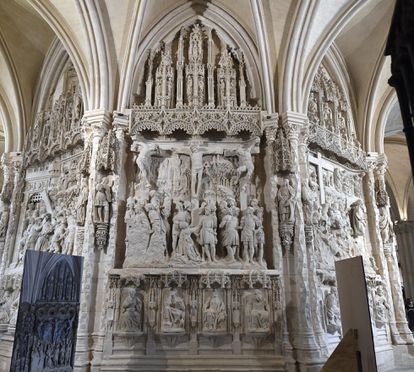 “La última gran obra de restauración fueron estas esculturas del trasaltar, de la girola de la catedral”, explica Payo frente a una obra del renacimiento español de Felipe Vigarny. La piedra usada, distinta a la del resto del templo procedente de las canteras de Hontoria, es blanca, fina, casi parece arena de playa. Miguel no recuerda un día que no tuviera que recoger o limpiar los trozos que caían de estos murales. “Después de un enorme esfuerzo de saneamiento, esperamos que pueda lucir de manera perfecta otros 500 años”, confía el catedrático.