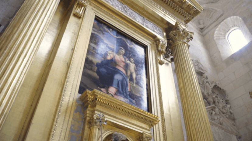 La parada en esta capilla sirve para hallar uno de los ejemplos del rico conjunto de pinturas que van desde la Edad Media al Barroco. “Es una pieza traída de Italia por don Gonzalo Díaz de Lerma, que se encuentra enterrado a los pies de la pintura y es una de las mejores obras que hay en España de la pintura del primer Cinquecento italiano”, afirma el experto sobre la tela realizada por Sebastiano del Piombo, uno de los discípulos de Miguel Ángel en la Roma de comienzos del siglo XVI. “Une la estética de la escuela romana con esas figuras sumamente corpulentas de la Virgen con el niño, con la escuela veneciana, de donde era el autor, en el paisaje que se desarrolla como telón de fondo”.