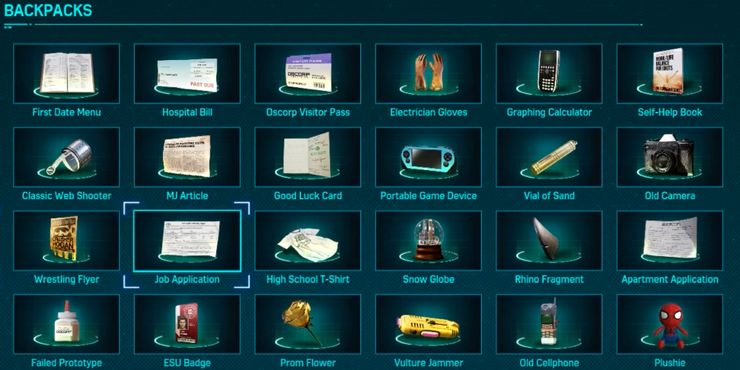 Había 55 mochilas para encontrar por toda la ciudad en El hombre araña de Marvel, y por lo general estaban en los lados de los edificios o atrapados en un pequeño rincón. Interactuar con cada mochila revelaría un nuevo elemento y un poco de la historia de fondo de Spider-Man. Algunos de ellos aludieron a peleas anteriores que Spider-Man tuvo con villanos, mientras que otros indicaron algunos de los momentos más memorables de Peter Parker con Mary Jane y otros personajes. Cada Mochila se usó para agregar más a la historia mientras permitía a los jugadores experimentar estas piezas narrativas en su tiempo libre.