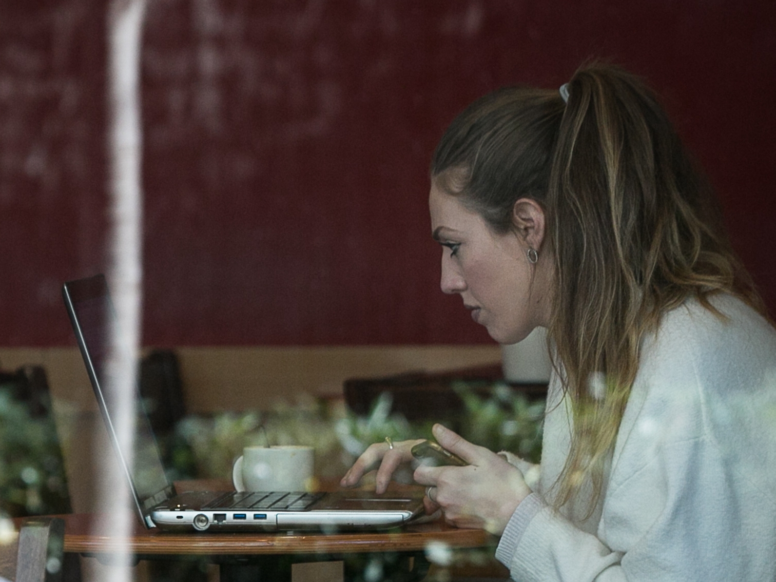 Una joven consulta su dispositivo móvil y su portátil a la vez mientras desayuna en el interior de una cafetería.Albert Garcia